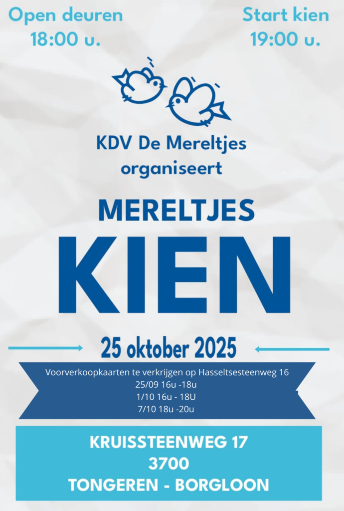 Na een langere pauze is het weer tijd voor de Mereltjeskien! Morgenavond kan je vanaf 18:00 terecht op de Kruissteenweg 17 in Tongeren-Borgloon. Je kan je kienkaart kopen aan de kassa (vvk is niet meer mogelijk). Doe mee en win verschillende prijzen!