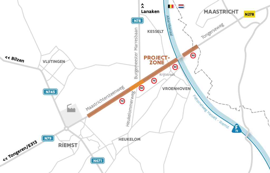 De grote projectzone loopt vanaf Riemst-centrum (net voorbij Klein Lafeltstraat) tot aan de grens met Maastricht. De brug over het Albertkanaal valt buiten het project.